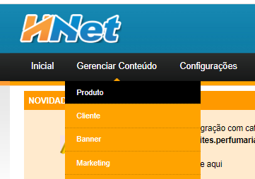 Para cadastrar produtos você acessa o menu GERENCIAR CONTEÚDO/PRODUTO